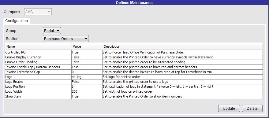 Purchase Orders, specifies how the Company handles Purchase Orders in the Portal. Controlled PO means that Purchase Orders must be approved by Head Office. Enable Display Currency prints the currency symbols in the statement. Enable Order Shading sets alternate lines in a Purchase Order to be shaded. Invoice Enable Top / Bottom Headers displays headers and footers on Purchase Orders. Invoice Letterhead Gap specifies the number of millimetres gap to allow for printed letterhead in Purchase Orders. Logo specifies an uploaded image to be attached to Purchase Orders, if the Logo Enable option is set. Logo Position sets the justification of the logo in the Purchase Order, where 0 is left, 1 is centre and 2 is right justified. Logo Width specifies the width of the logo in the Purchase order - the height of the logo will be scaled accordingly. Show Item sets whether or not to display the Portal's item numbers in the Purchase Orders.