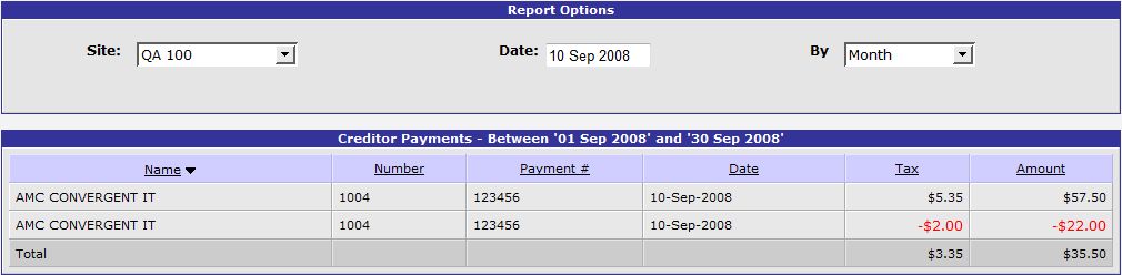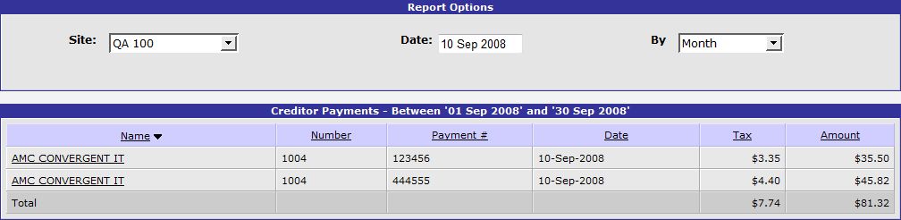 The Paid Transactions link in the Creditor Reports section of the Creditor Menu opens the Creditor Payments report. This report displays the details of all Creditor Payments made by the selected Site during the specified period. The Creditor Name, Creditor Number, Payment Reference Number, Date of the Payment, Tax and Total Amount Paid are displayed in this report for each Payment transaction.