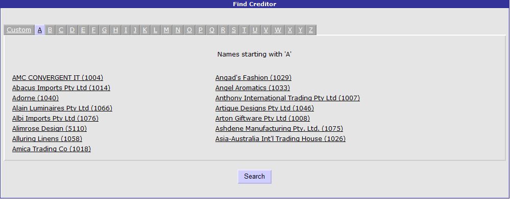 The first method of Purchase Order creation that we will look at in this tutorial is manual entry. This is where the user manually enters each item to be ordered from a specific supplier (also known as a Creditor in the Portal). Select the Edit Orders link from the Purchase Orders section of the Procurement Menu which opens the Find Creditor screen. This screen allows you to search for a Creditor to create the Purchase Order for. You have the option to enter the Creditor's name or number in the Custom tab of this screen or select the first letter of the Creditor's name to display all Creditors beginning with that letter.