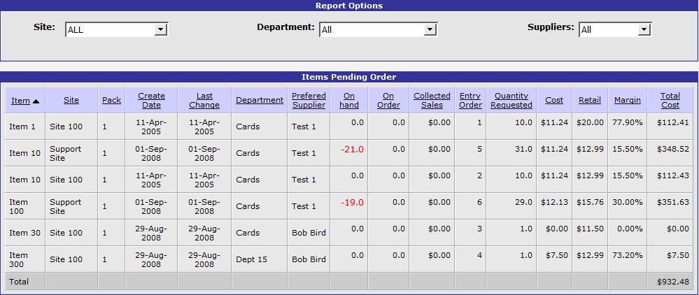 The other available report is called the Purchase Order Supplier Summary Report which displays totals of items ordered by Supplier for a selected Site and period according to the Purchase Order status. This report is useful to identify the totals of items for pending Purchase Orders for your Suppliers, for example.